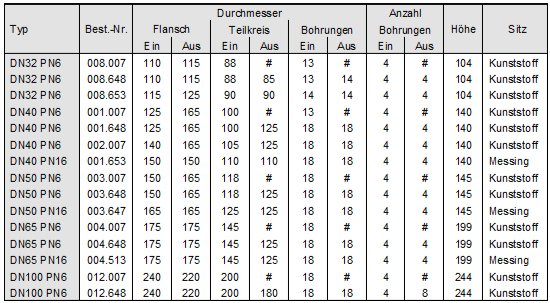 Das Material des Kugelsitzes richtet sich nach dem zu erwartenden maximalen Systemdruck. Alternativ kann der Kugelsitz in Kunststoff- oder Messingausführung geliefert werden.